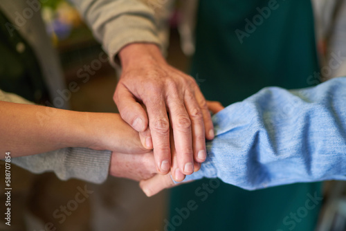 People stack hands for cooperation and team building