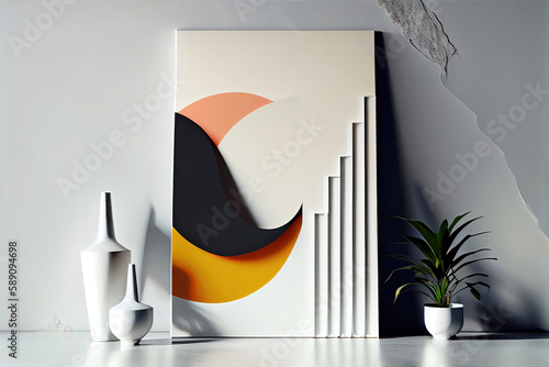 Minimalist abstract image in picture frame leaning on wall (Generative AI)