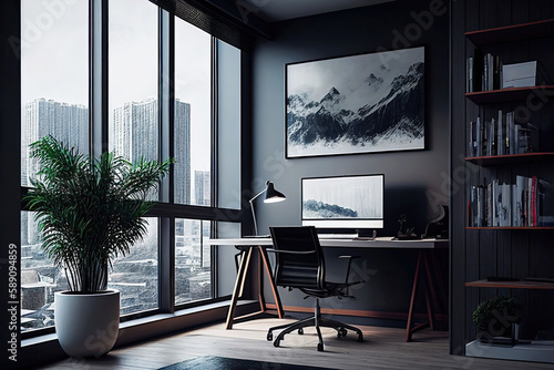 Modern luxurious office room in highrise building with view as interior design concept illustration (Generative AI)