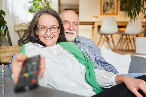 Paar Senioren mit TV Fernbedienung jubelt glücklich