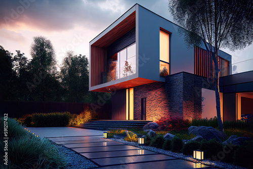 Illustration of modern detached house with beautiful garden as city real estate photography (Generative AI)