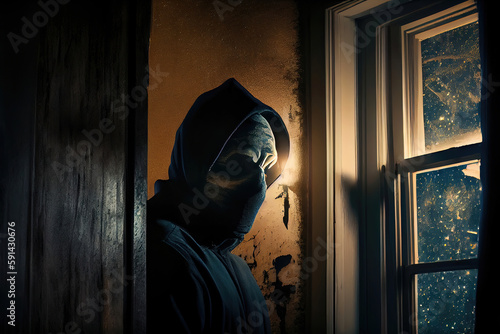 Burglar with face mask breaking into house for stealing (Generative AI)