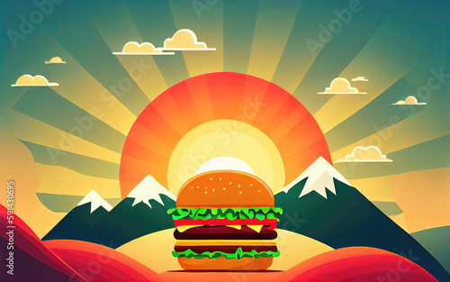 Cartoon illustration of cheesebzurger or hamburger in landscape (Generative AI)
