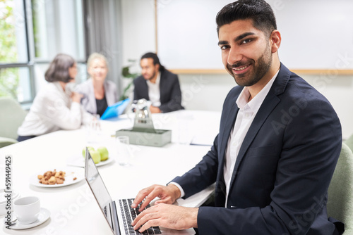 Lächelnder Geschäftsmann arbeitet am Laptop Computer