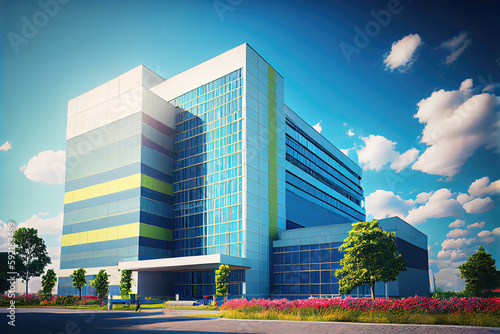 Modern city hospital building as digital real estate photography illustration (Generative AI)