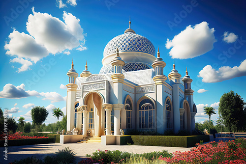 Beautiful little mosque in summer garden as real estate photography illustration (Generative AI)