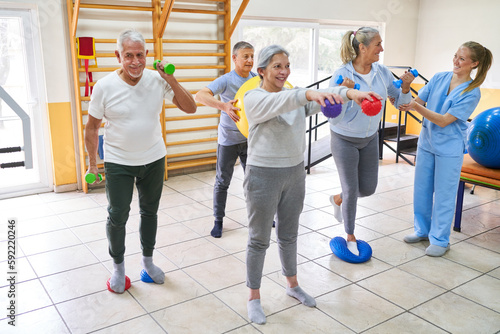 Physiotherapist assisting elderly woman in movement therapy at rehab center