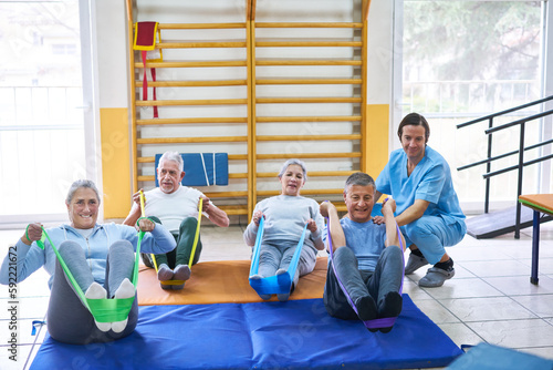 Physiotherapist assisting elderly woman in movement therapy at rehab center