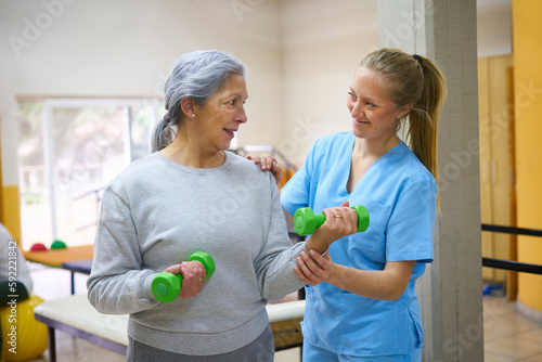 Physiotherapist assisting elderly woman in movement therapy at rehab center
