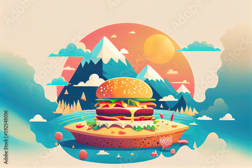 Cartoon illustration of cheesebzurger or hamburger in landscape (Generative AI)
