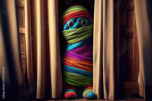 Cute funny colorful mummy hiding on Halloween behind curtains (Generative AI)