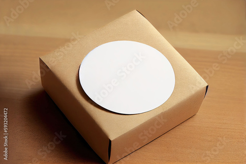 Round blank white label sticker on parcel as mockup template digital illustration (Generative AI)