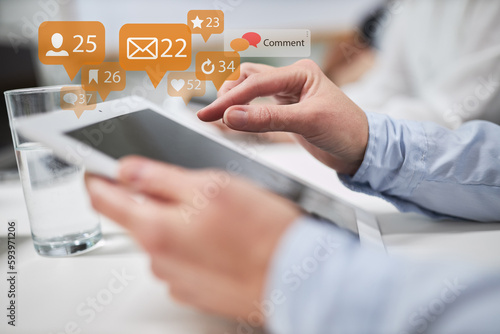 Hände tippen auf Touchscreen mit vielen Benachrichtigungen