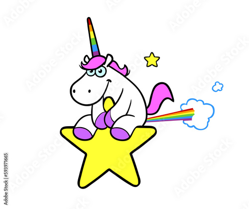 Cartoon Einhorn auf Stern sitzend pupst einen Regenbogen