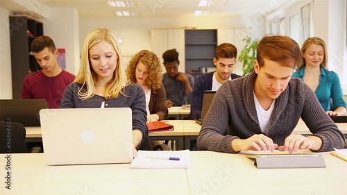 Zufriedene Studentin steht vor Tafel mit Muskel Armen als Konzept