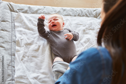 Mutter gibt Baby auf Wickeltisch einen zärtlichen Kuss