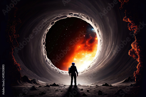 Futuristic space traveller standing in front of black hole (Generative AI)