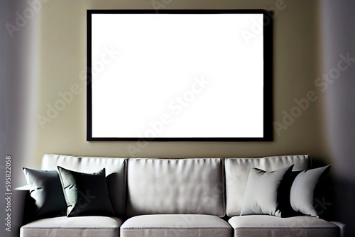 Empty picture frame over sofa as mock-up template (Generative AI)