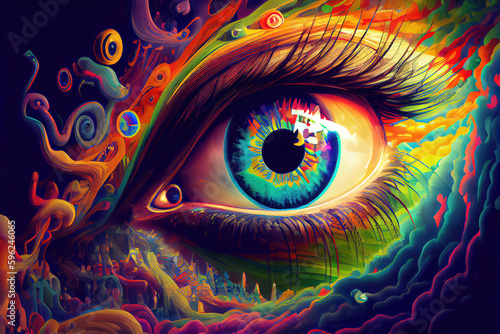 Close-up of human eye in trippy psychdelic colors (Generative AI)