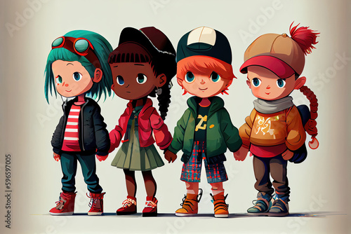 Groupf of smiling cartoon girls holding hands (Generative AI)