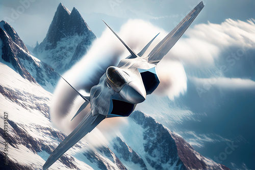 Military fighter jet breaking sound barrier over snow-covered mountains (Generative AI)