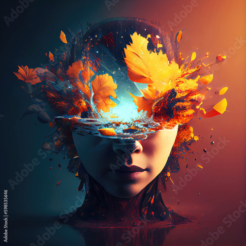 Surrealist illustration of female face with color splashes (Generative AI)
