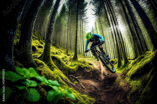 Mountain biker riding bike in downhill competition in forest (Generative AI)