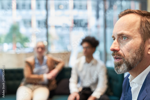 Group of business professionals engaged in a productive discussion at a modern office