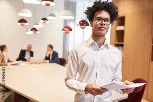 Business Mann mit Afro Frisur mit Team im Hintergrund