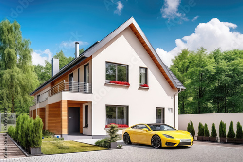 Illustration of modern detached house with beautiful garden as city real estate photography (Generative AI)