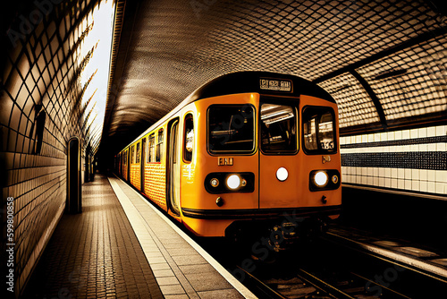 Yellow subway arriving at underground train station (Generative AI)
