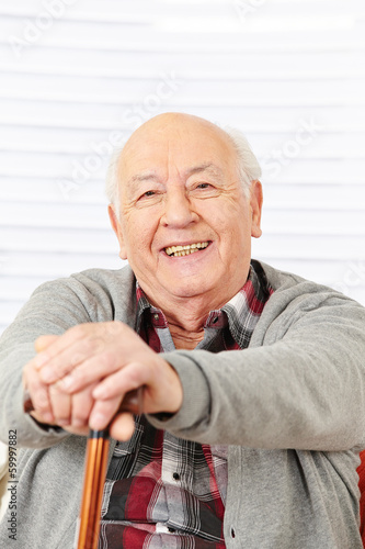 Senior lächelt mit Gehstock