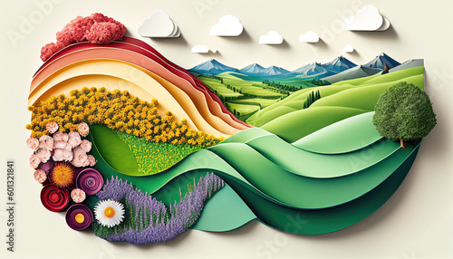 Colorful abstract mountain landscape with fields in rainbow color (Generative AI)