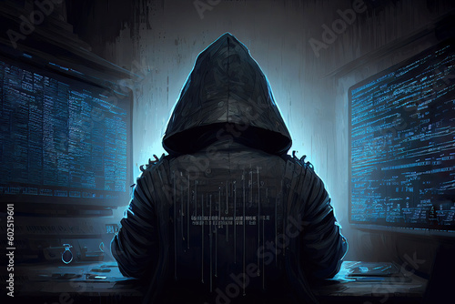 Hakcer doing illegal coding on computer screens (Generative AI)