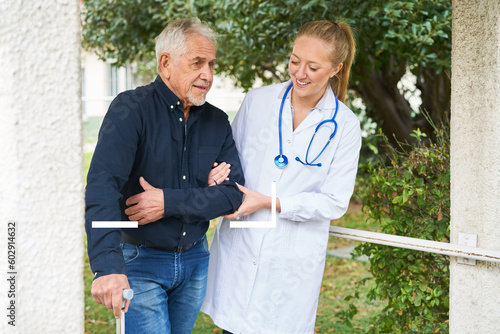 Female doctor supporting disabled senior man to walk in garden