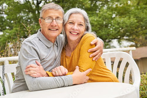 Happy senior couple embracing at table in garden