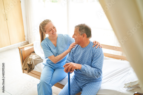 Physiotherapist assisting elderly woman in movement therapy at rehab center