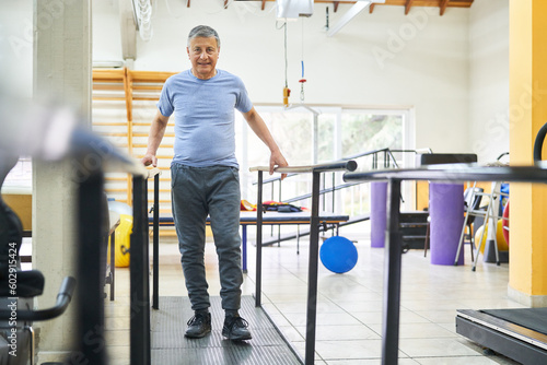 Physiotherapist assisting elderly woman in movement therapy at rehab center