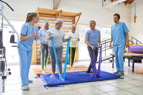 Physiotherapist assisting elderly woman in movement therapy at rehab center