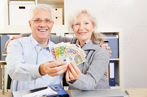Zwei Senioren halten Euroscheine hoch