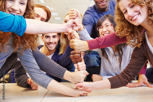 Students stacking fists in school