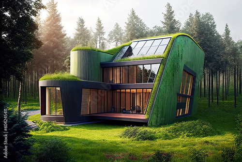 Illustration of green modern self-sustaining low energy family home on garden ground (Generative AI)