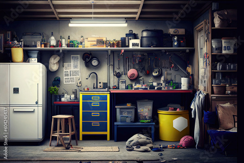 Soft focus on a bustling vehicle garage interior with mechanic workspace