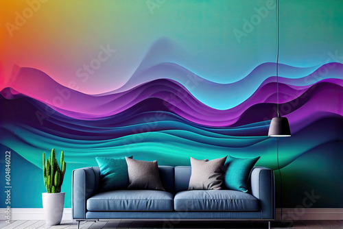 Sofa in living room with colorful gradient wallpaper design (Generative AI)