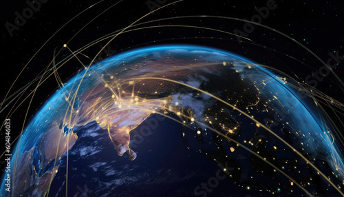 Illuminated earth at night showcasing global network connections and technology on a dark backdrop