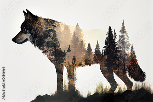Double exposure of wolf with forest landscape (Generative AI)