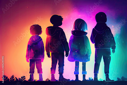 Eerie children group as silhouette with gradient background (Generative AI)