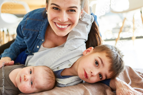 Happy smiling mother with baby and big brother