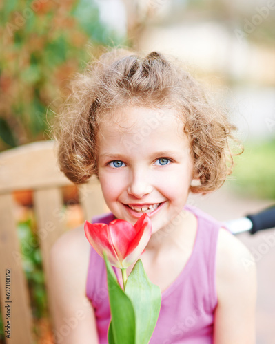 Mädchen lächelt mit roter Tulpe