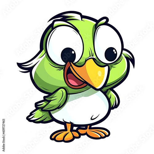 Happy smiling green parrot as cartoon character design (Generative AI)